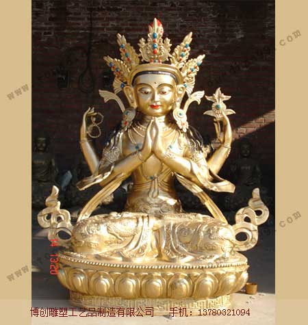 四臂觀音是雪域西藏的守護(hù)神,與文殊菩薩、金剛手菩薩,合稱三族姓尊.代表大悲、大智、大力,為密乘行者人人必修的法門。四臂觀音是雪域西藏的守護(hù)神,藏人由老至幼家家戶戶,皆吟誦其六字大明咒:“嗡嘛呢叭咪吽”。四臂觀音的造型每一莊嚴(yán)皆有所表,一頭表通達(dá)法性,四臂表四無量心,身白色表清潔無垢,不為煩惱、所知二障所障。四臂觀音的報(bào)身相中:白色身代表清凈無暇,四臂代表四種佛行,即‘息’、‘增’、‘懷’、‘誅’等。四臂觀音菩薩身顏潔白如月,頭戴五佛冠,發(fā)黑色結(jié)髻,中央二手合掌於胸前,捧有摩尼寶珠,右手持水晶念珠。左手拈八瓣蓮花與耳際齊,面貌寂靜含笑。